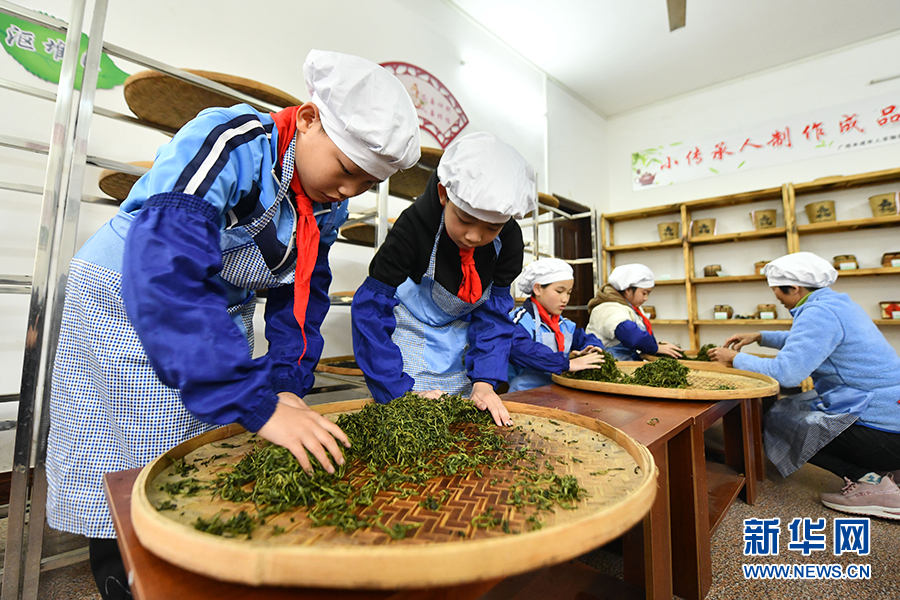 在广西梧州市苍梧县六堡镇中心校,同学们在学习制茶。新华社记者 黄孝邦 摄