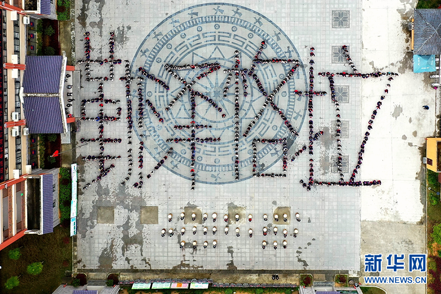 在广西河池市南丹县里湖瑶族乡王尚小学,学生在大课间开展勤泽格拉表演。新华网发 高东风 摄