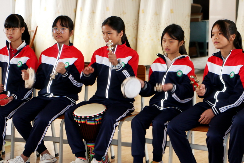 12月2日,在鹿寨县导江小学乡村少年宫,县文明办派出心理辅导志愿者向留守学生、脱贫儿童一起传授敲军鼓,在敲军鼓中锻炼大家的团结写作进取精神。今年送教活动以“疫路同行·鼓舞童心“为主题,通过心理辅导,普及心理健康知识,有效服务学校心理健康的教育,全面提高素质教育水平。赖建辉/摄