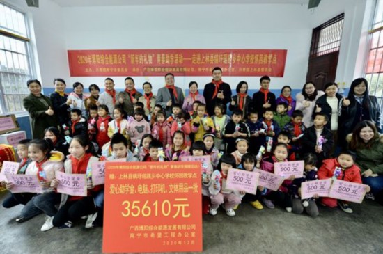 12月23日下午,由共青团南宁市委员会主办,广西博阳综合能源发展有限公司、南宁市希望工程办公室、共青团上林县委员会承办的“2020年博阳综合能源公司新年的礼物青春助学活动“在上林县镇圩瑶族乡怀因教学点举行,103名学生以及老师获赠价值3.5万多元的爱心助学金及一批“新年的礼物“,这些礼物包括打印机、扫描仪、文体用品、图书等,改变了该教学点办公用品破旧匮乏的困境。