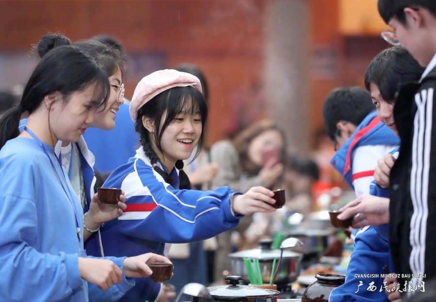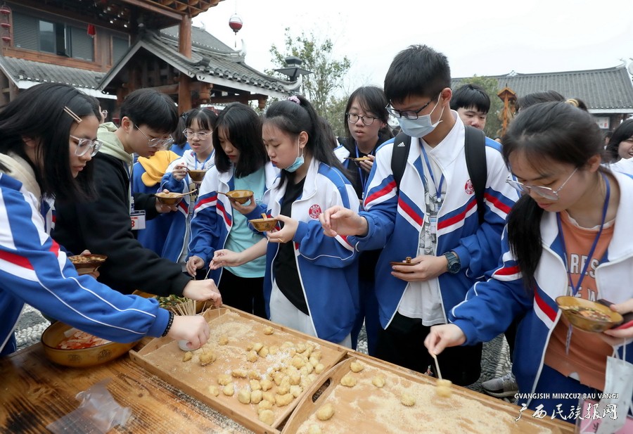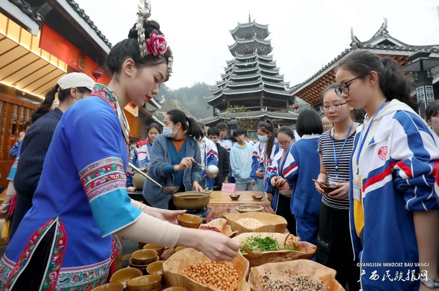 3月26日,学生们在三江侗族自治县月也侗寨景区品尝油茶。