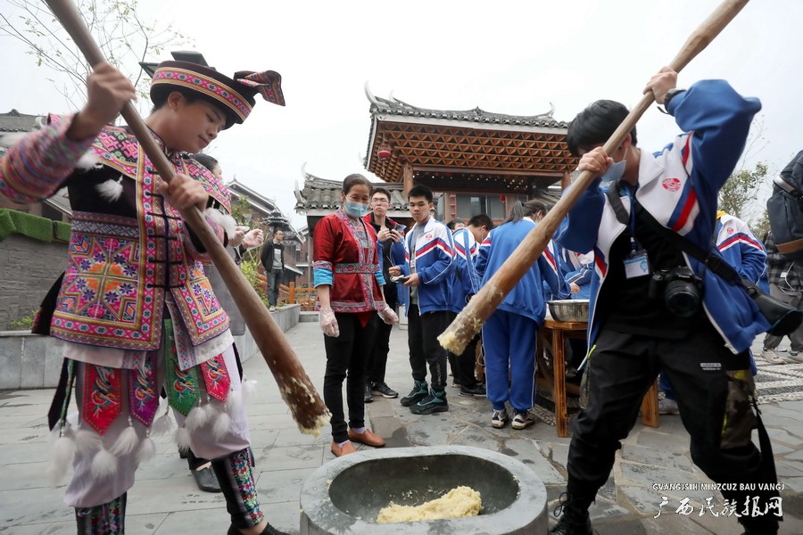 3月26日,学生们在三江侗族自治县月也侗寨景区品尝糍粑。