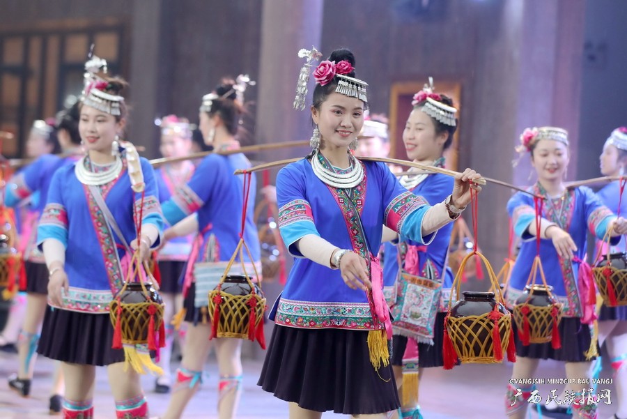 3月26日,演员们在三江侗族自治县月也侗寨景区挑酒参加百家宴。