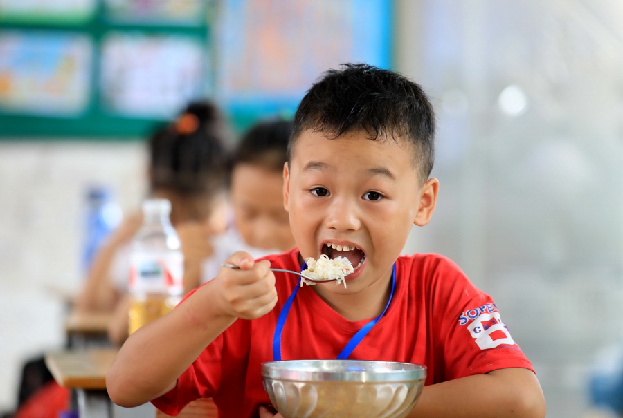 8月30日,在柳州市融安县大坡乡岗伟村小学,学生们在吃营养午餐。当日是2021年秋季开学的第一天,柳州市融安县根据当地饮食习惯和学生营养需要,科学制定多套食谱,让开展营养午餐的学校自行选择,确保学生们吃饱吃好。