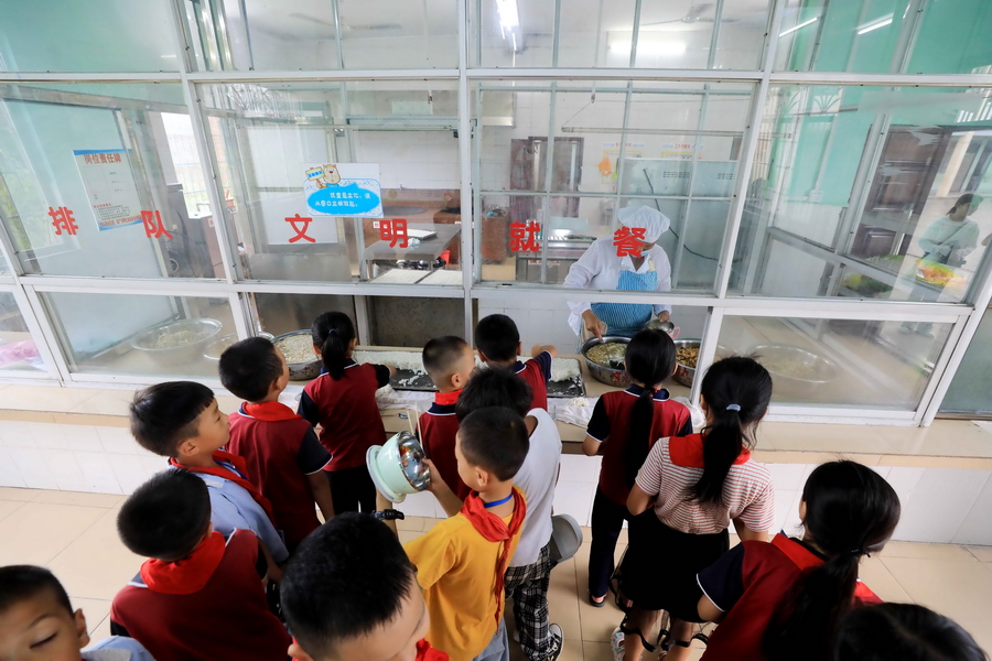 8月30日,在柳州市融安县大坡乡岗伟村小学,学生们在排队领取营养午餐。(谭凯兴 摄)