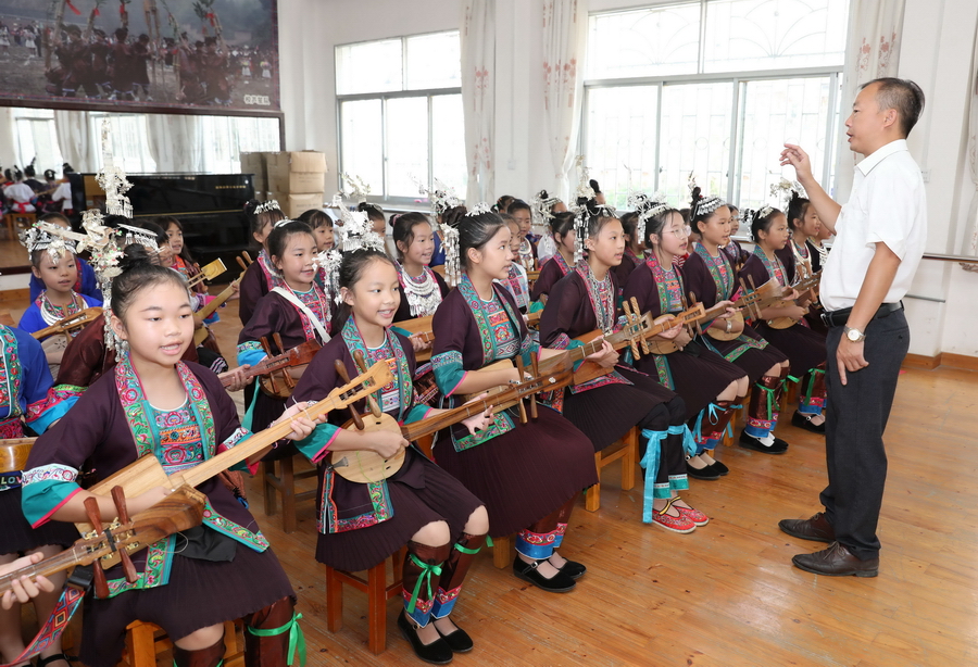 9月11日,三江侗族自治县民族实验学校教师杨驰在指导学生弹唱侗族琵琶歌