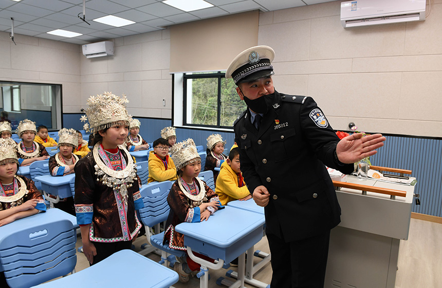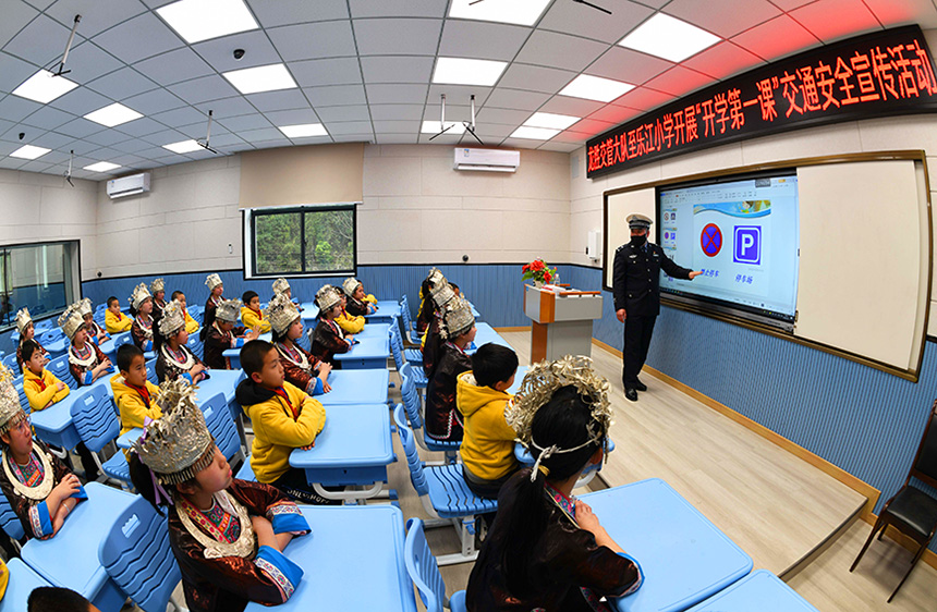 2月21日,广西桂林市龙胜各族自治县各中小学校、幼儿园迎来开学第一天,学校组织开展形式多样的开学第一课,向学生们讲授交通安全、健康卫生等知识,促进学生健康快乐成长。
