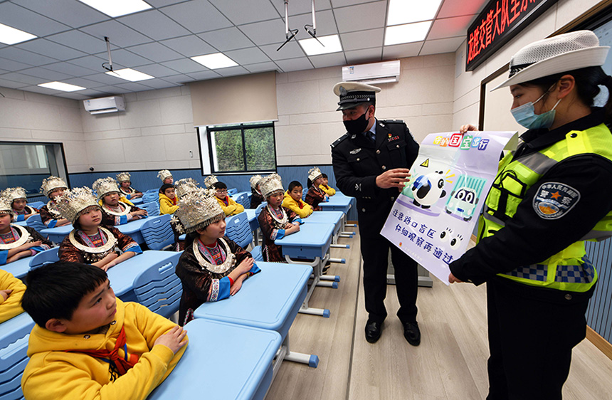 在广西龙胜各族自治县乐江镇乐江小学,龙胜交管大队民警在给学生们讲解交通安全法规。