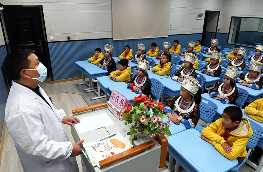 在广西龙胜各族自治县乐江镇乐江小学,医务人员在给学生们讲解健康卫生知识。