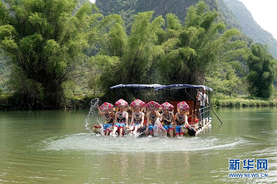 巴马瑶族自治县的姑娘在盘阳河上泛舟戏水。高东风摄