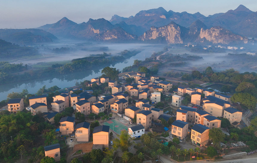广西兴业:晨雾缭绕 群山宛如水墨画