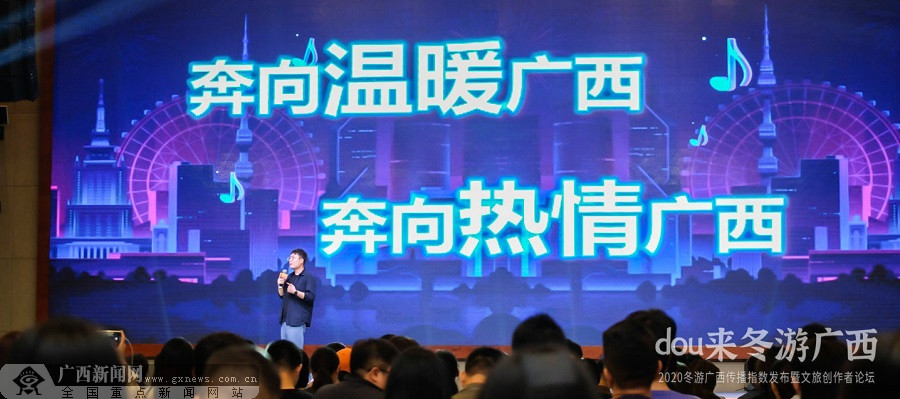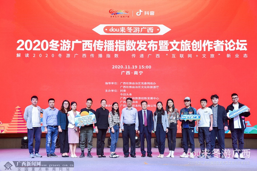 广西新闻网南宁11月20日讯(记者 黄诗淇 麦一帆实习生 覃金蓉)11月19日下午,“dou来冬游广西——2020冬游广西传播指数发布暨文旅创作者论坛“在南宁举行。全区各市文化和旅游行政管理部门分管领导以及各地文化和旅游企业代表、业界专家学者、文旅达人和媒体记者等齐聚一堂,共创交流,共同探索互联网上的“冬游广西“魅力。