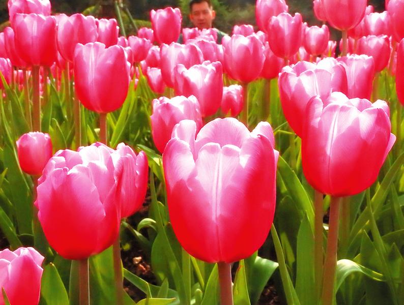 迎春花展以“遇(郁)见小康“为主题,共展出郁金香约40万株,共有7大色系40多个品种。其中,“紫玛格丽特““哥伦布“是较为少见的重瓣品种。