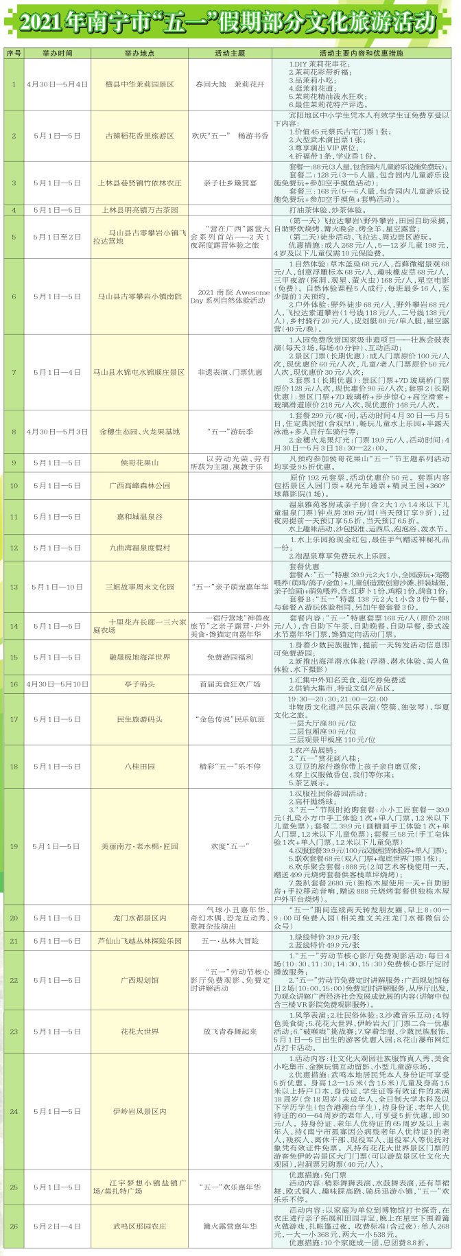 5月1日—5日中午,在清泉湖舞台进行青春版刘三姐山水实景演出,提供全新视觉体验,青春靓丽的阿哥阿妹带着游客重温“三姐“经典故事。每天11时30分和13时30分,可爱的玩偶、安保小哥哥、民族风小姐姐组成的巡游队伍沿着东大门、园博大道、清泉湖广场进行欢乐巡游,跳起热门舞蹈,让假期充满欢乐气氛。景区在园博大道摆开长桌宴,游客可现场品尝壮乡特色美食,体验热情的敬酒民俗,还有精彩的民歌、多耶舞互动,让游客尽享民族风情。