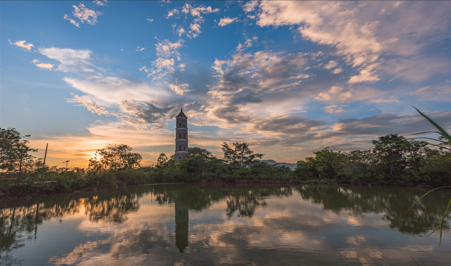 9月5日,多彩晚霞映衬下的蓉峯古塔与美丽多姿的田园美景形成一幅美轮美奂的摄影水彩画。(黄海摄)