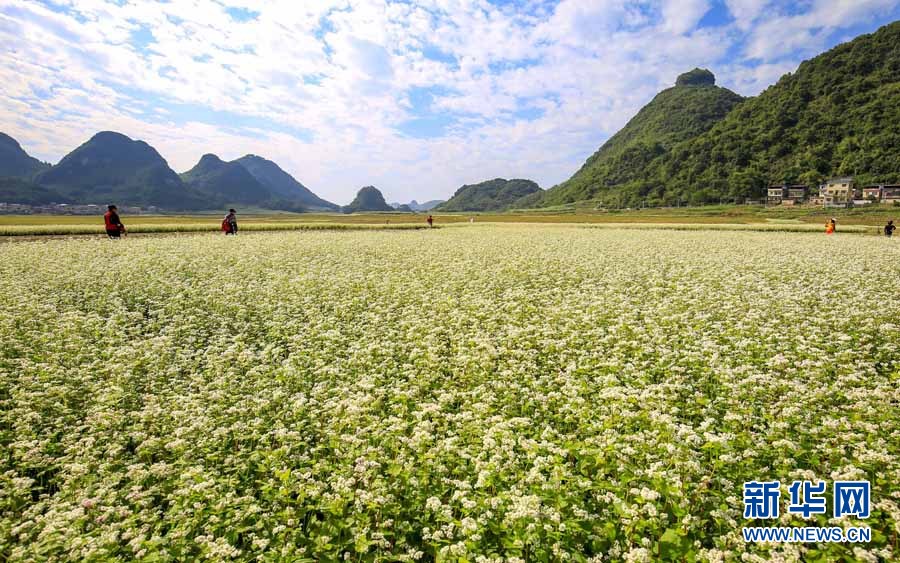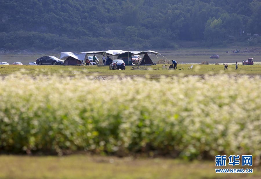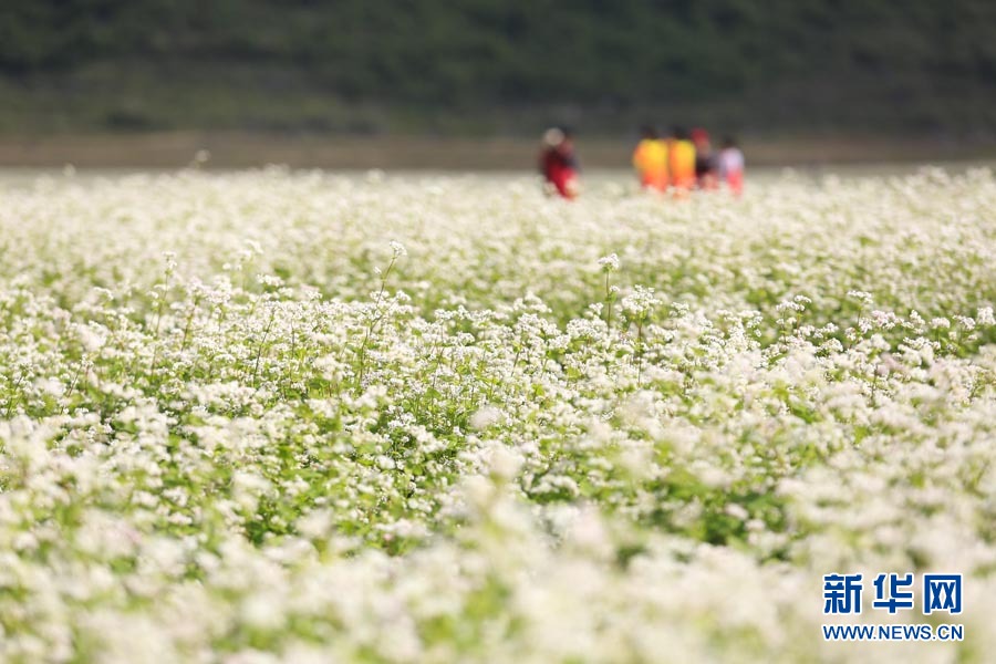 游客在柳州市柳城县古砦仫佬族乡独山水库库区的荞麦花丛中游玩;