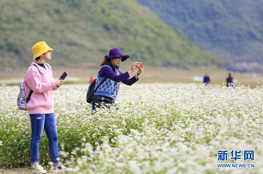 游客在柳州市柳城县古砦仫佬族乡独山水库库区的荞麦花丛中拍照留影;