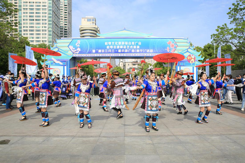 活动现场。杨忠钰摄为打响广西“壮族三月三”民族节庆品牌,进一步展示桂鄂两省(区)特别是广西(南宁)少数民族地区文化和旅游的独特魅力,4月8日,桂鄂文化旅游联合推广会、桂鄂非遗精品艺术展演暨“潮玩三月三·相约游广西(南宁)”活动在湖北省武汉市汉口江滩举行。本次活动由广西壮族自治区文化和旅游厅、湖...