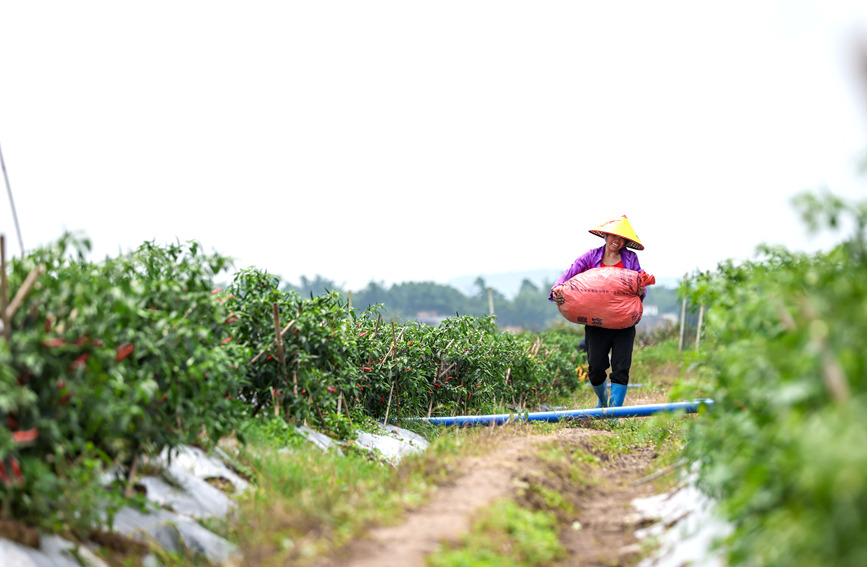 人民网钦州6月7日电 时下,正值指天椒采摘旺季,在广西为农指天椒种植有限公司500亩辣椒园内,农户们将刚采摘好的辣椒从田间地头运到加工厂,从晾干、挑选到包装运输,现场一派热火朝天的景象。
