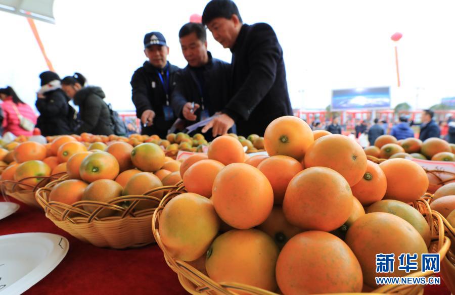 12月12日,在柳州市融安县“金桔选美“比赛现场,工作人员在展示“金桔王“。