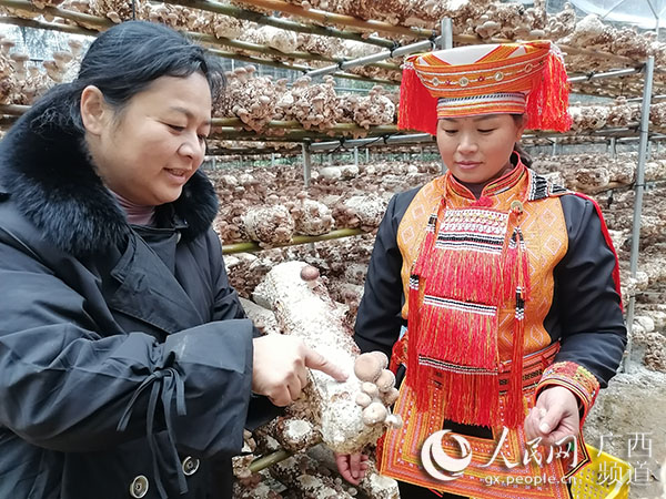 12月20日,来自广西生态职业技术学院、驻林秀村第一书记黎承梅在给村民指导香菇培育。蒙海摄