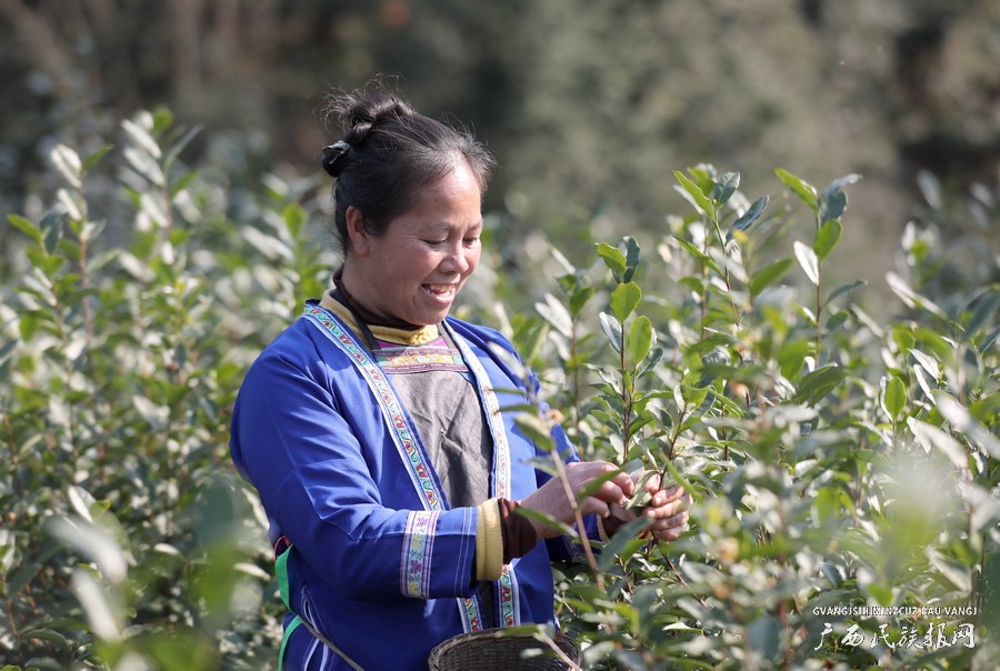 1月19日,一名妇女在三江侗族自治县梅林乡车寨村平寨屯茶园基地采摘新茶。