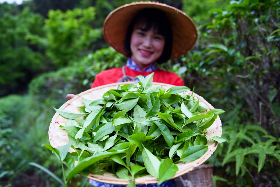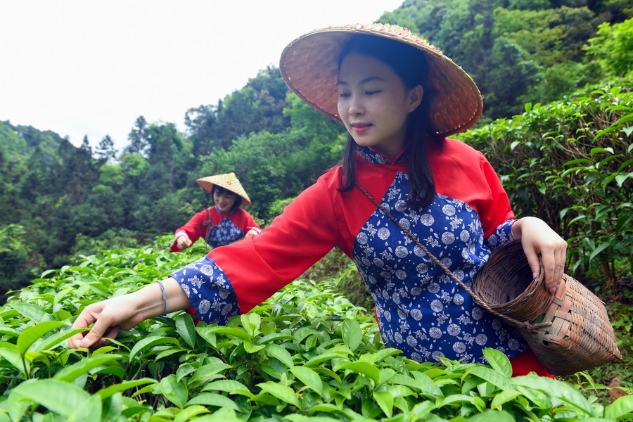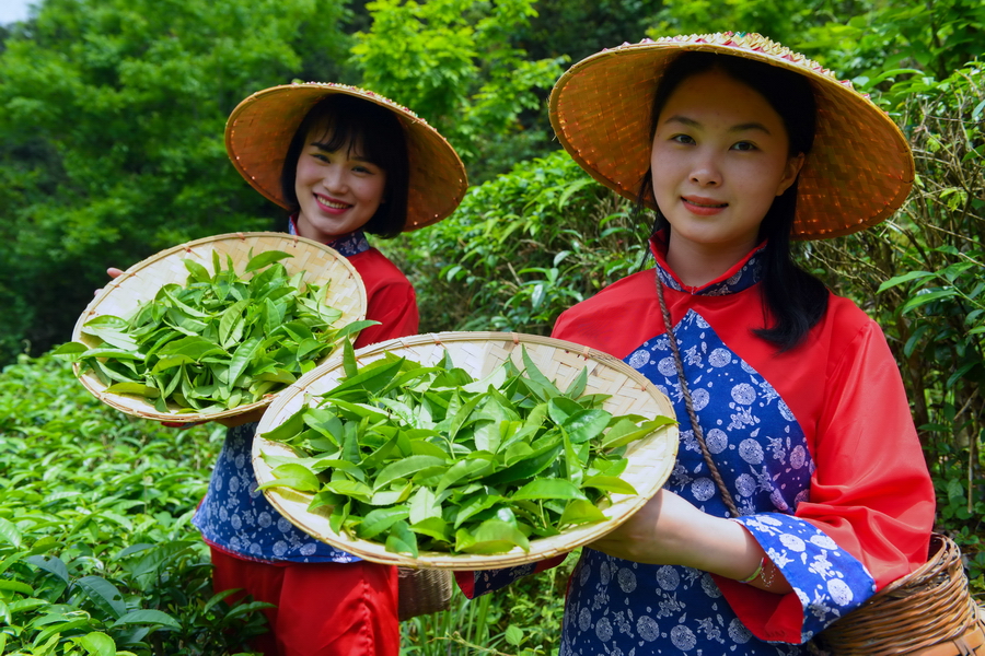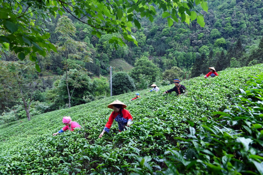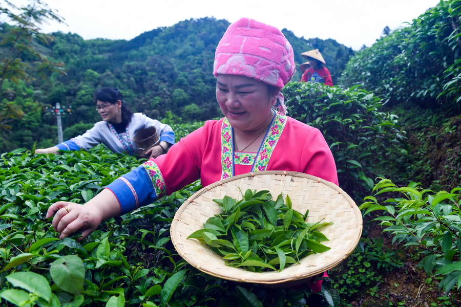 “谷雨“时节,龙胜各族自治县各地茶园进入鲜叶采摘“黄金季“,茶农们抢抓农时,上山赶采“谷雨茶“,茶园里一派繁忙景象。“谷雨茶“是谷雨时节采摘的春茶,又叫二春茶,新茶色泽翠绿、叶肥汁满、汤浓味厚,为茶中上品。(吴生斌 蒙树梅 /摄)