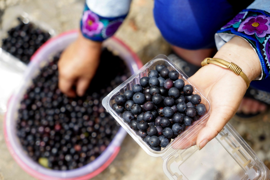 7月6日,在广西柳州市融水苗族自治县白云乡高兰村,一名苗族妇女在分拣刚采摘高山蓝莓。