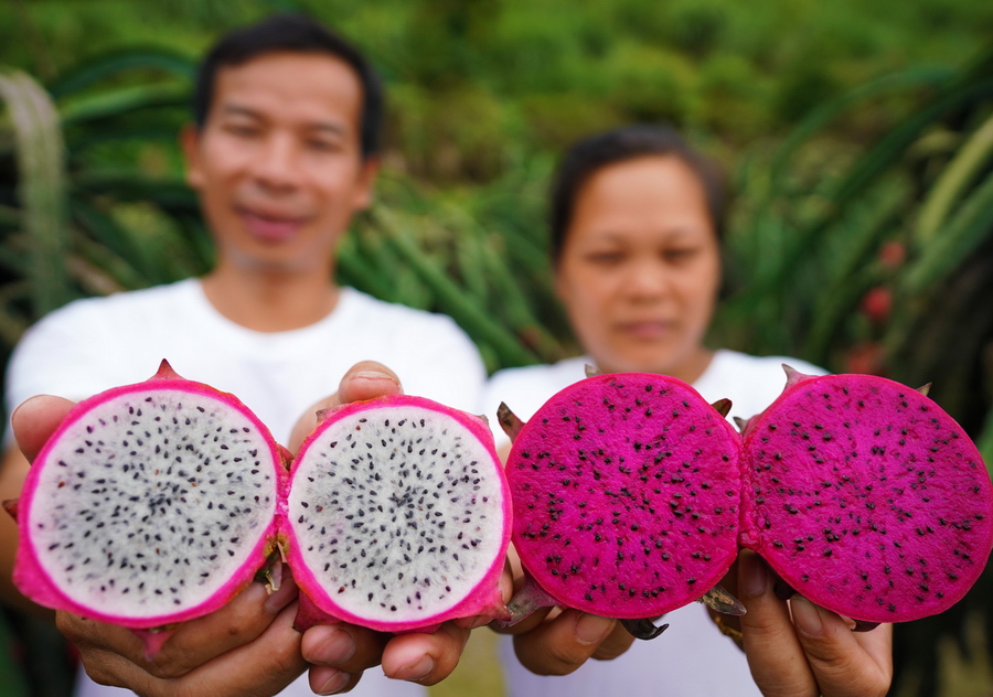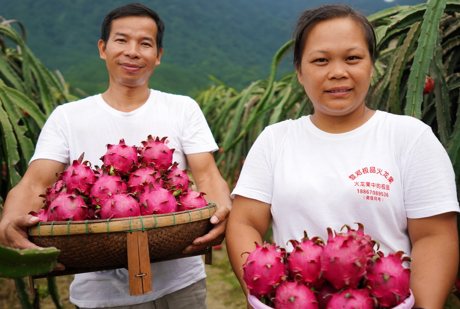 8月22日,在融水苗族自治县融水镇三合村黎邓火龙果基地屯,果农在展示刚采摘的火龙果。