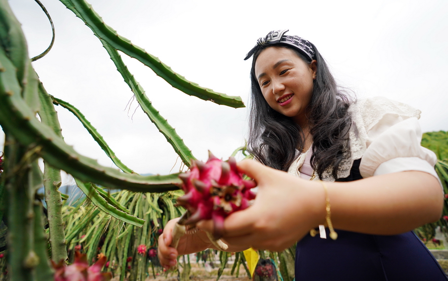 8月22日,在融水苗族自治县融水镇三合村黎邓火龙果基地屯,一名游客在采摘火龙果。