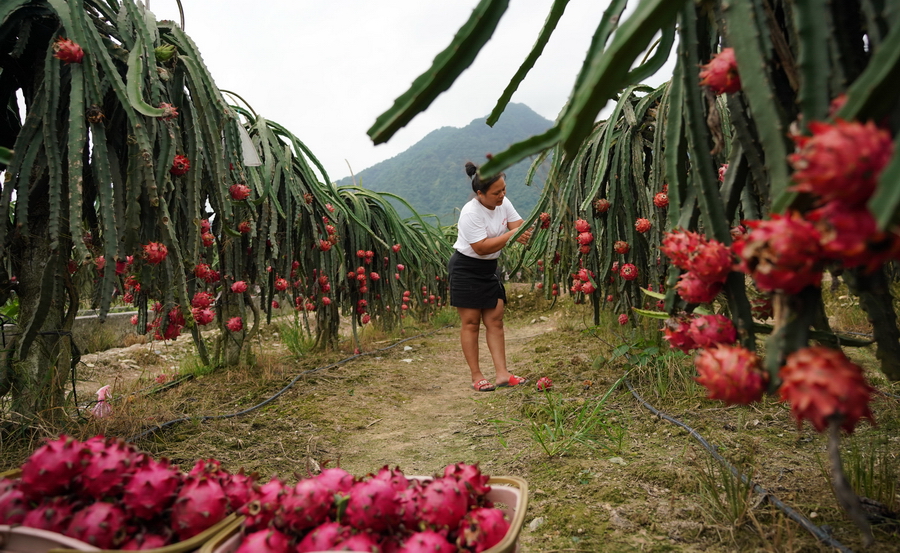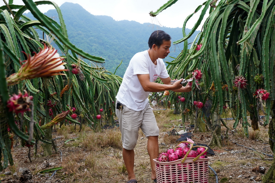 8月22日,在融水苗族自治县融水镇三合村黎邓火龙果基地屯,果农在采摘火龙果。