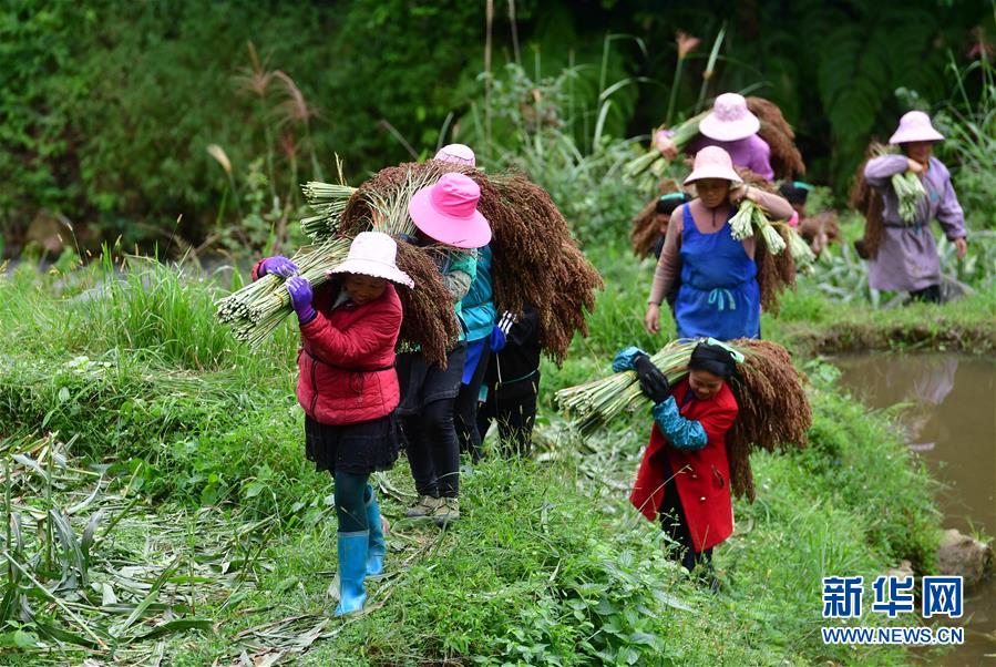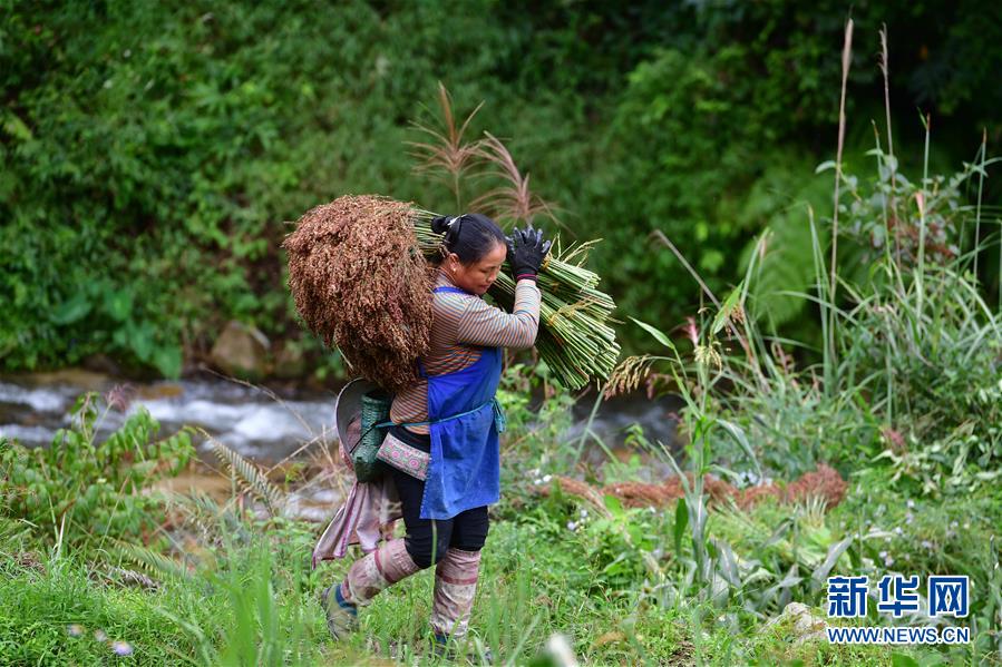10月7日,在柳州市融水苗族自治县杆洞乡党鸠村乌英苗寨,村民在搬运刚刚收割的红小糯高粱。