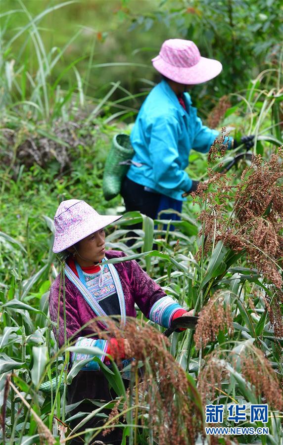 10月7日,在广西柳州市融水苗族自治县杆洞乡党鸠村乌英苗寨,村民在收割红小糯高粱。