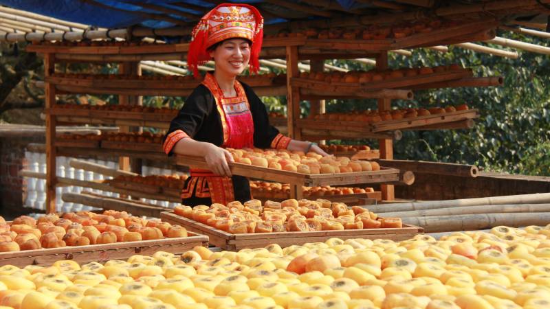 一名瑶族姑娘正在将柿子放到晒场上晾晒。平乐县融媒体中心供图