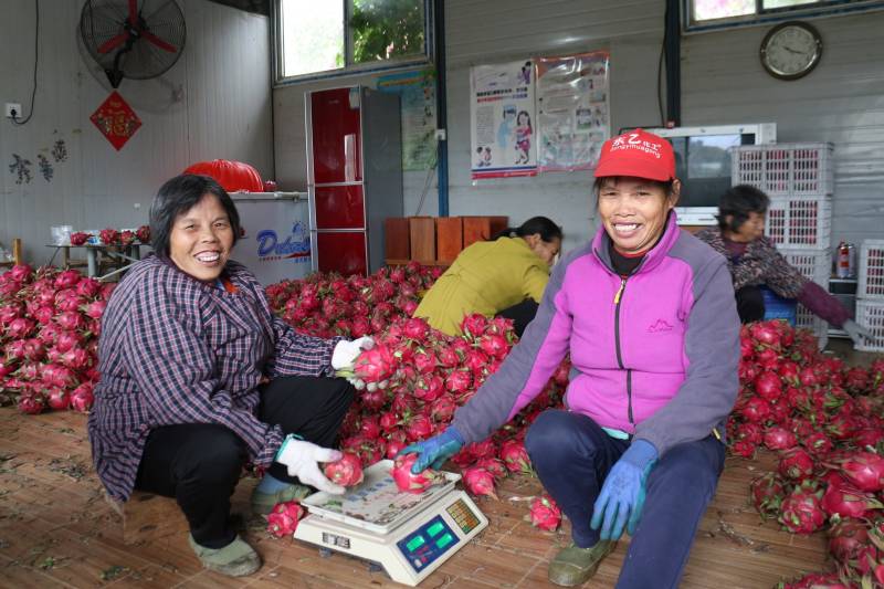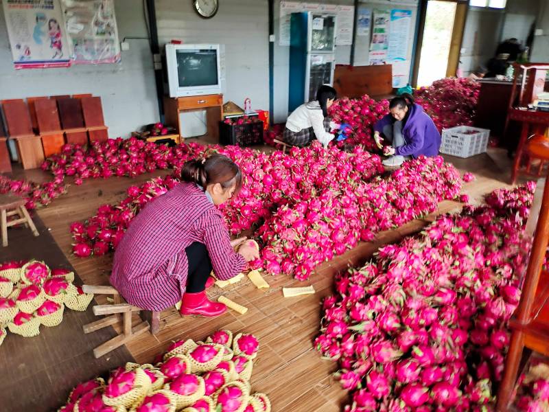 农户们正在将火龙果称重分拣。梁玉萍摄