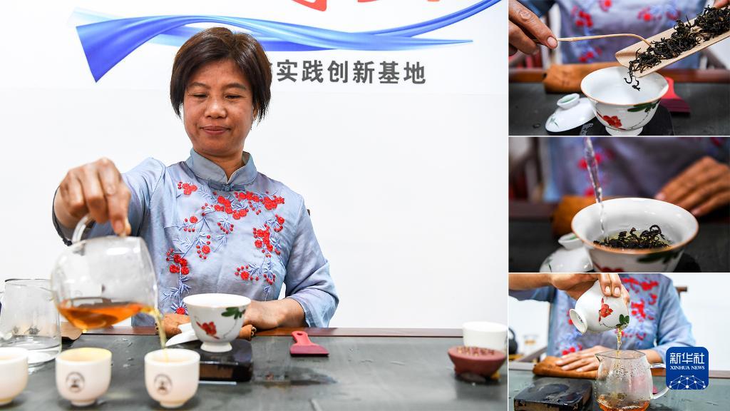 12月10日,卢花暖冲泡自己制作的红茶(拼版照片)。