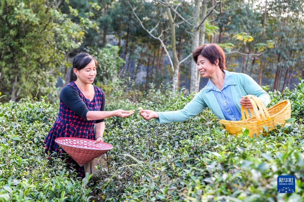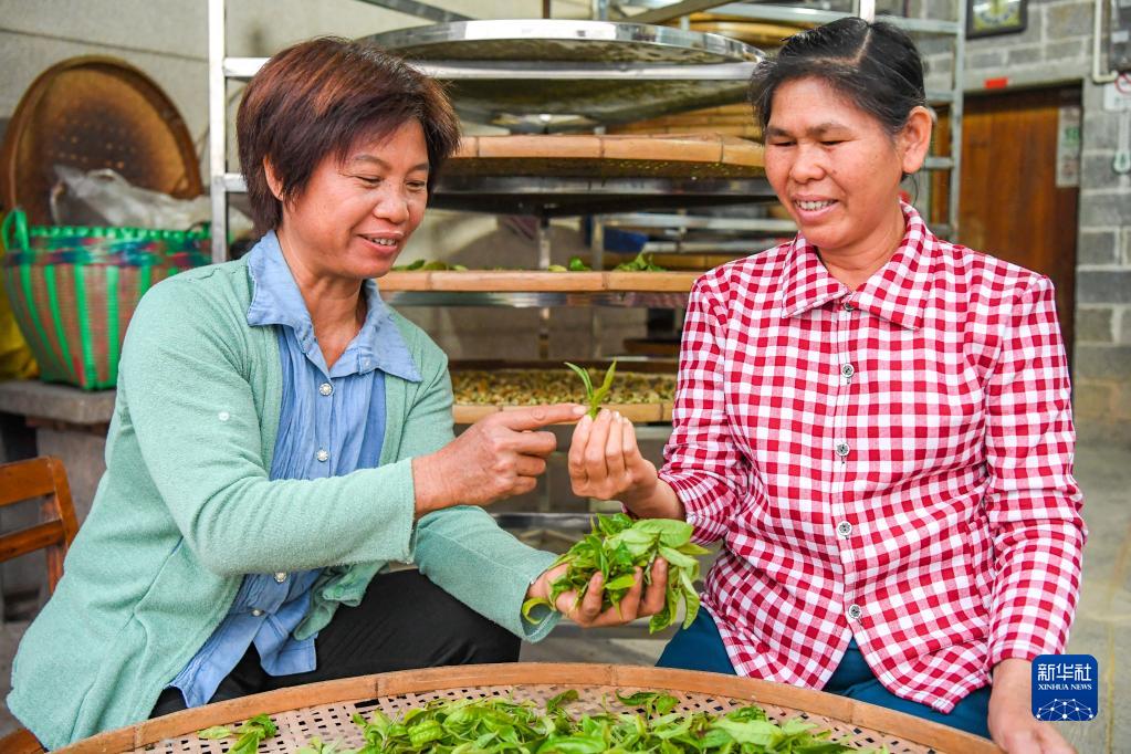 12月10日,卢花暖(左)为本村茶农讲解茶叶的筛选标准。