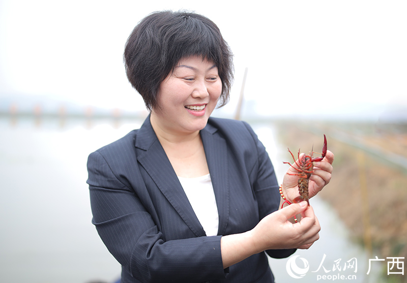 企业负责人在展示当地养殖的小龙虾。人民网 吴明江摄