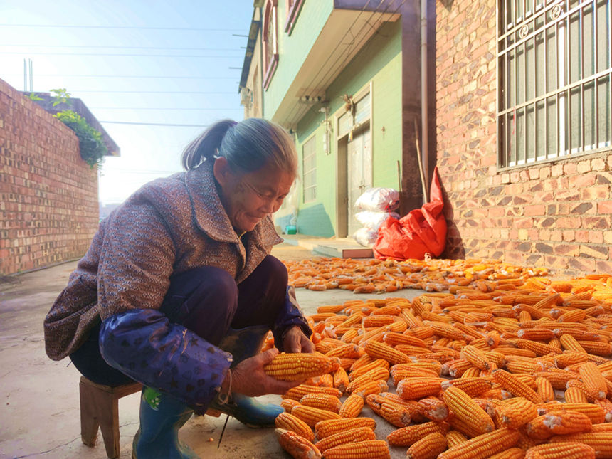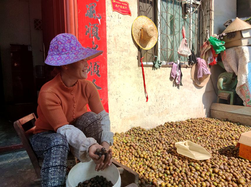 当地农民在家门口晒油茶果。当地农民在家门口晒油茶果。