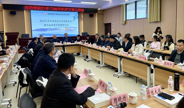 研讨会现场 在中国作协第十次代表大会召开前夕,河池学院办学70周年庆典之际,12月4日,新时代多民族地区文学发展路径暨河池学院作家群研讨会在河池学院举行。本次研讨会作为河池学院70周年校庆文学周重要活动之一,由河池学院文学与传媒学院主办。班源泽、凡一平、田湘、区晓菲、费城、杨合、...