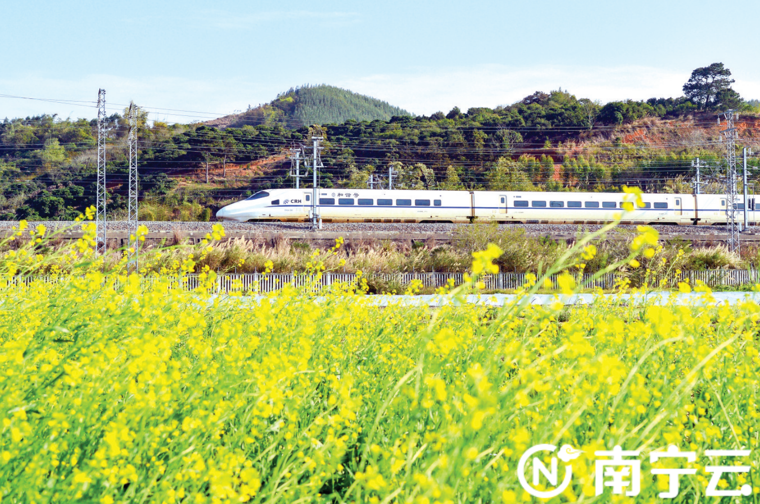 列车从油菜花海旁飞驰而过,开往希望的春天。记者 黄维业 摄