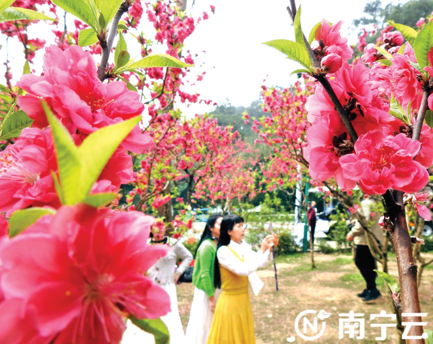 在青秀山风景区,如云似霞的樱花盛放在青山绿水间,游人闲绕花行,感受春的浪漫;黄花风铃木也迎来了花期,风铃状的黄花团团簇簇压满枝头,为绿城风景添上一抹明艳亮丽的黄,令赏春的人心情格外明媚;“人面桃花相映红“,盛放的桃花吸引众多游客前来拍照留念。