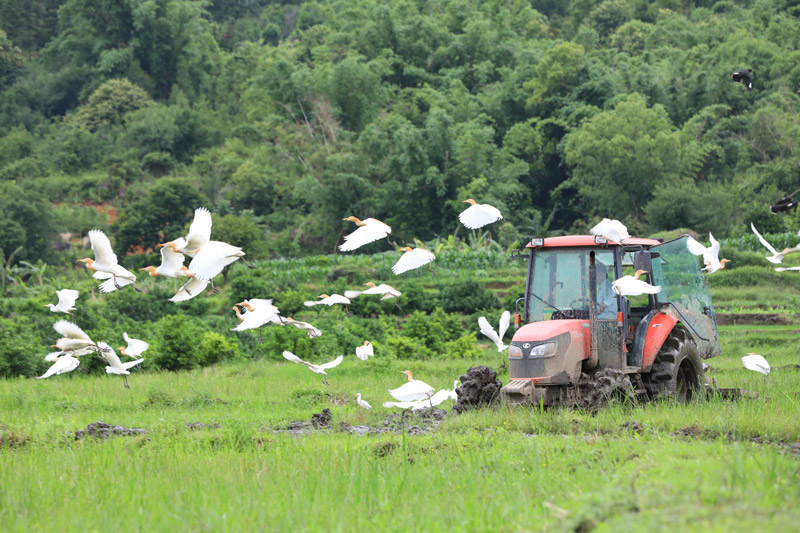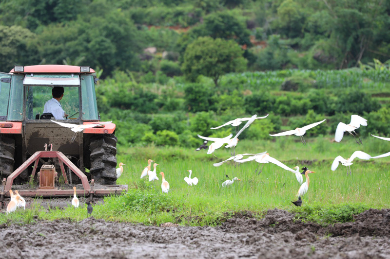 5月24日,在广西恭城瑶族自治县三江乡安冲村,当地群众驾驶拖拉机在进行翻耕稻田作业,成群结对的白鹭在翻耕后的水稻田里飞翔、觅食,白鹭、农机、山野、稻田,构成了一幅人与自然和谐相处的生态画卷。近年来,当地不断加大城乡生态环境治理力度,生态环境持续改善,引来越来越多的白鹭栖息安家。