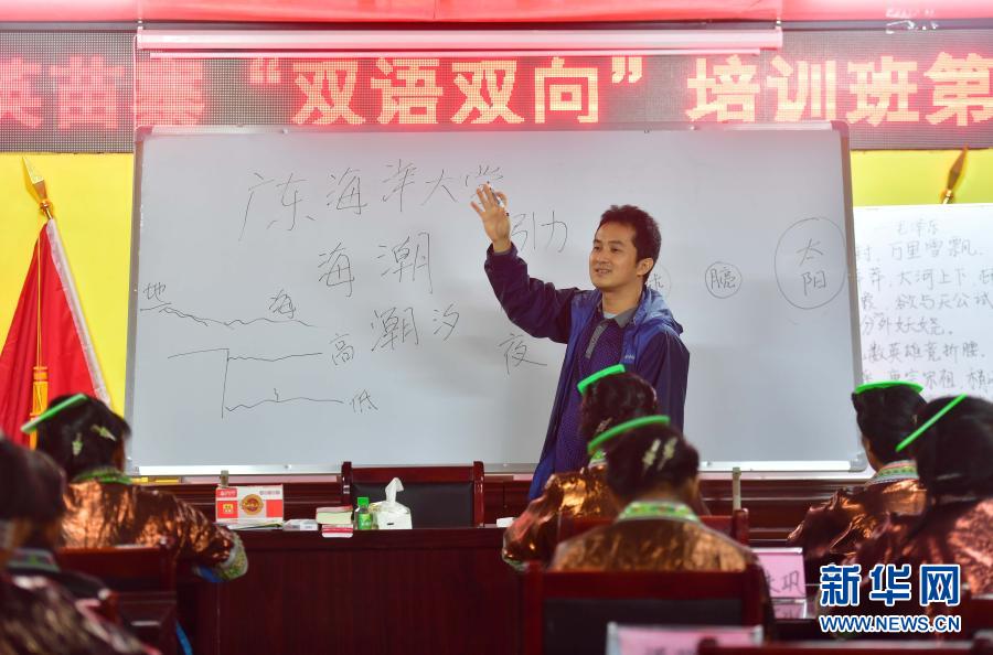 在广西融水苗族自治县杆洞乡党鸠村乌英苗寨,广东海洋大学教授陈涛在给夜校班的妇女们上课(10月16日摄)。