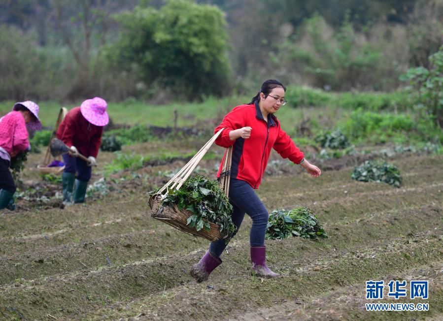 在广西融水苗族自治县永乐镇红薯种植基地,返乡创业青年石秋香和当地农民在红薯种植基地准备种植红薯苗(3月14日摄)。32岁的石秋香目前带动2400多名贫困群众种植红薯4000多亩。