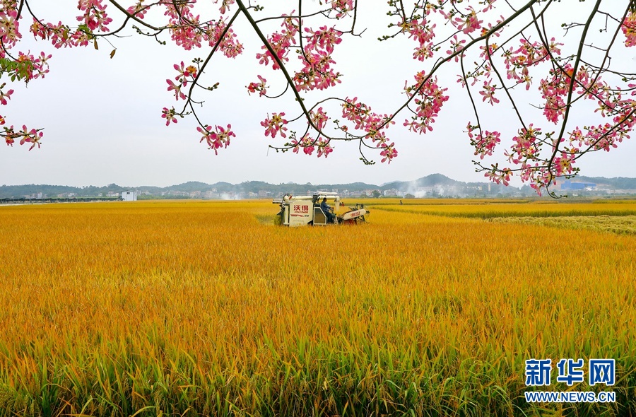 初冬时节,收获的旋律仍在八桂大地上回响。在广西横县,晚稻迎来收获季,广袤的田野里一片金黄,成群的飞鸟掠过金色的稻田,粉嫩的花儿在田边绽放,一台台收割机忙碌穿梭,呈现一幅美丽丰收画卷,令人心醉。