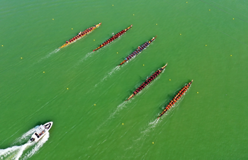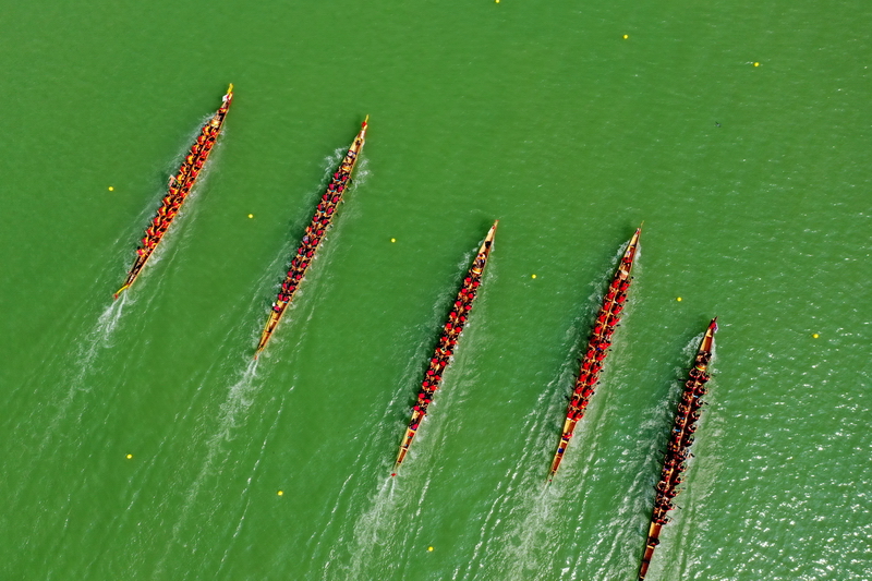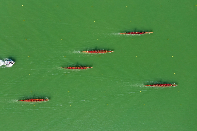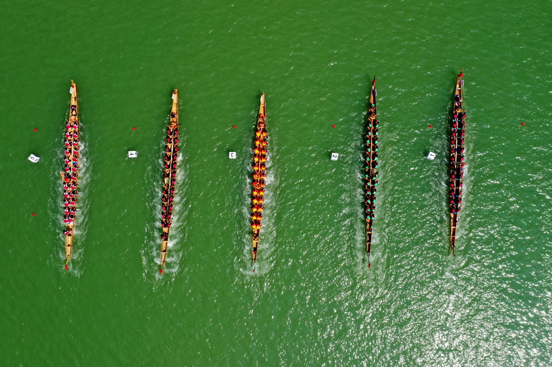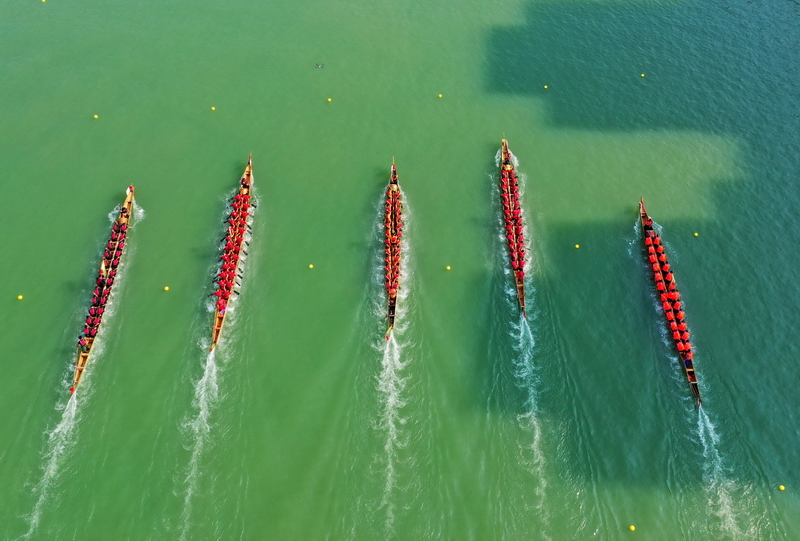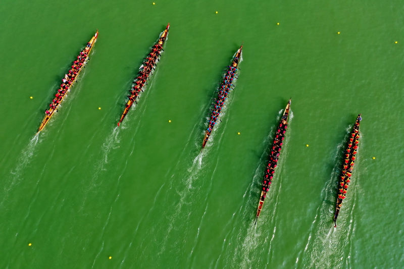 10月11日,参赛队员在融江广西柳州市融安县城段江面上举行的传统27人龙舟赛(男子组)800米直道竞速比赛中奋力划桨。连日来,柳州市融安县举行2020柳州市职工运动会龙舟赛、2020广西融安龙舟公开赛暨融安第二十一届长安龙舟大赛,来自融安、融水、三江等地的100余支队伍1000余名运动员在珠江上游的融江广西柳州市融安县城段江面上展开激烈角逐,倡导全民健身理念,集中展示当地各族干部群众脱贫摘帽迎接小康的良好精神风貌,共同庆祝丰收。