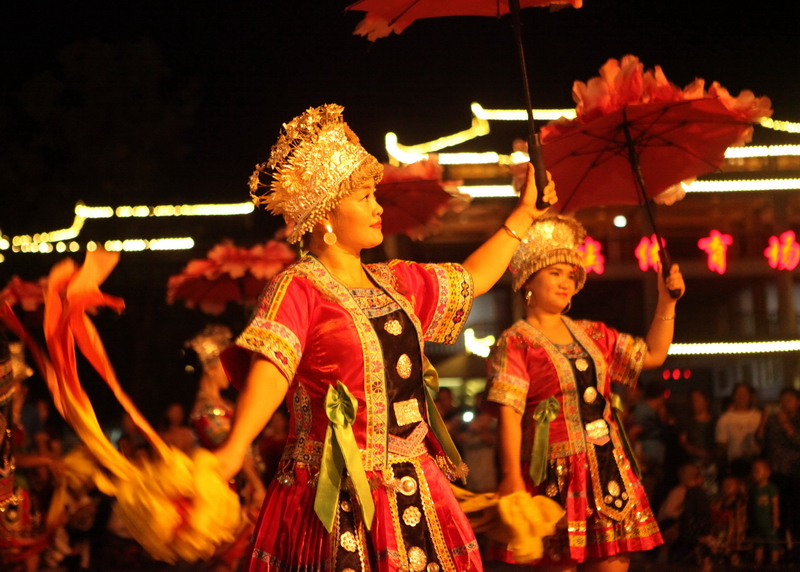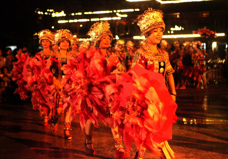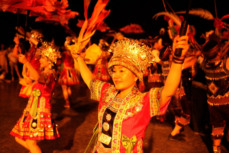 随着国内防控疫情的好转,旅游业又兴旺起来。2020年9月12日晚,柳州市融水苗族自治县在民族体育公园开展吹芦笙、跳踩堂舞、拉鼓、玩竹竿舞活动,吸引众多观众观看,热闹非凡。(廖子渊)