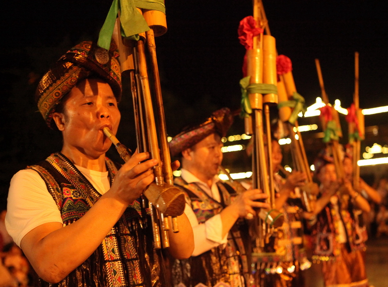 9月12日晚,在柳州市融水苗族自治县民族体育公园,苗族男女青年在跳芦笙踩堂舞。