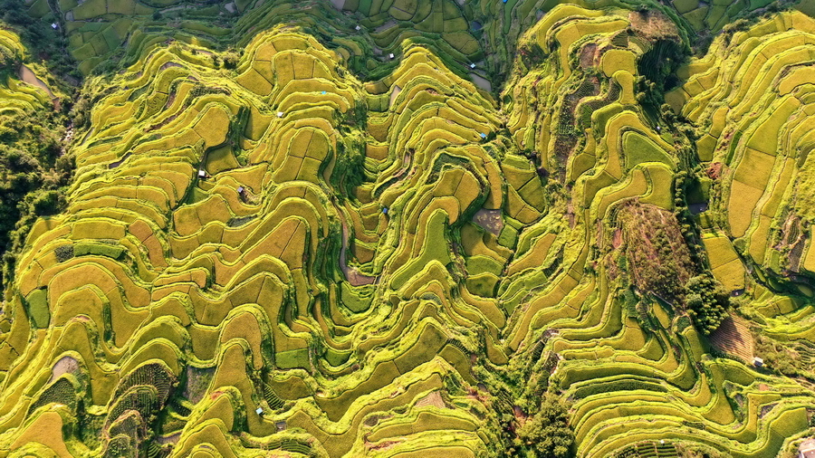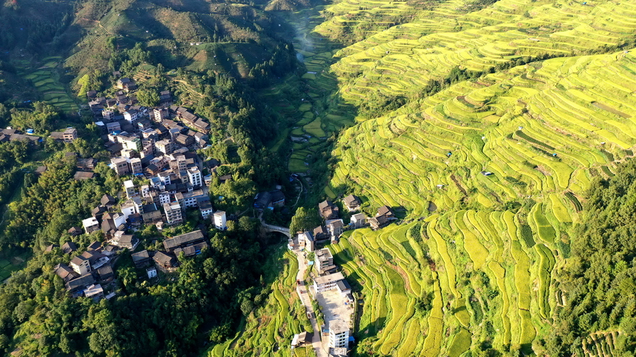 金秋时节,三江侗族自治县同乐苗族乡高武村、桂书村的连片梯田在夕阳的映射下格外金黄,与周边特色民居、翠绿山林、蜿蜒道路交相辉映,构成一幅幅迷人的秋景图,美不胜收。(龚普康)